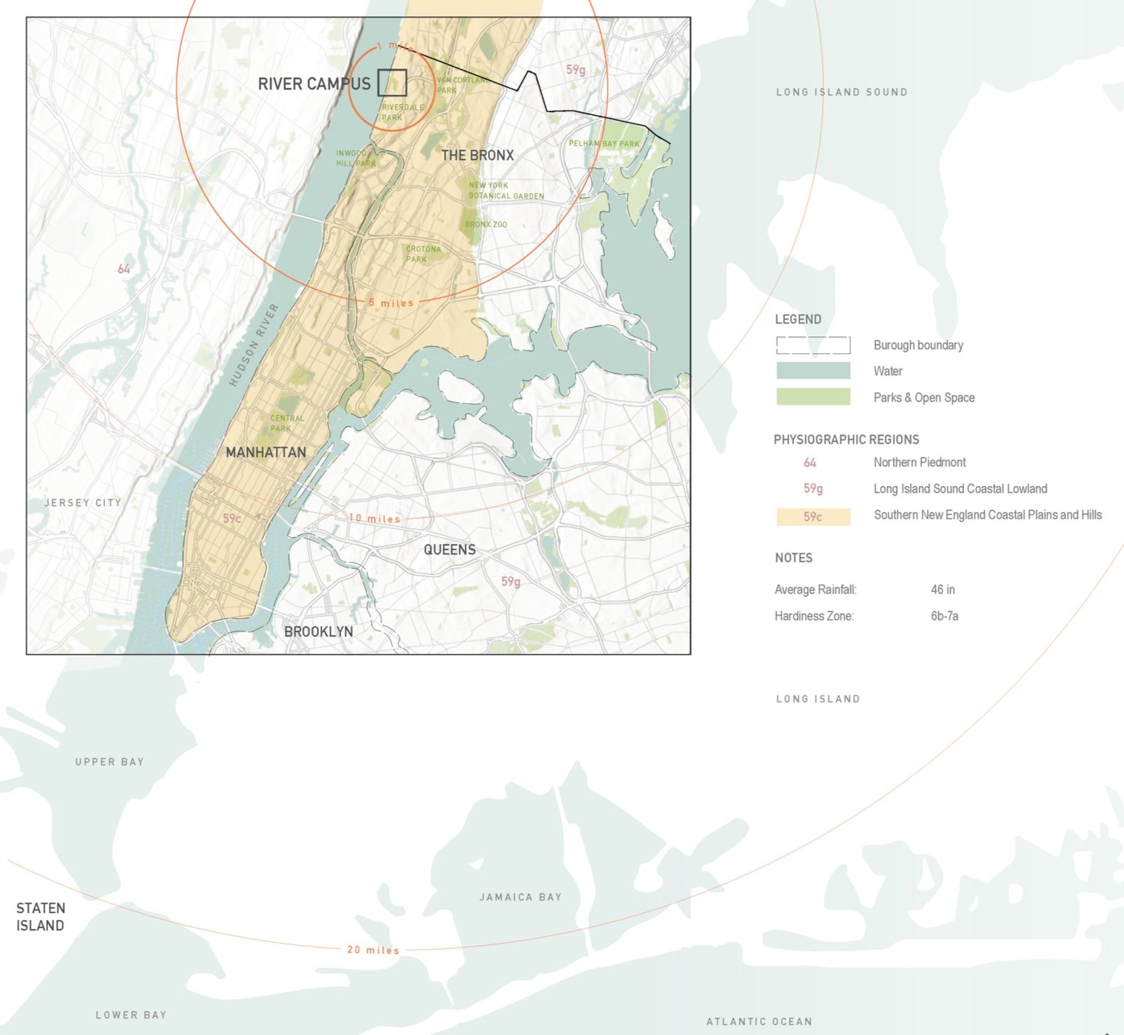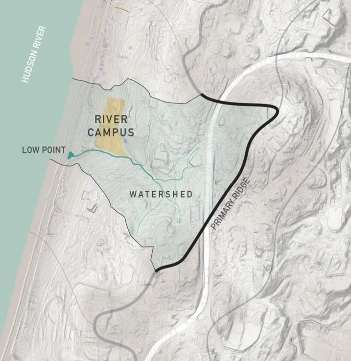 With long vies out over the Hudson River and ample space to spill out into a neighboring park, the River Campus offers a special opportunity for youth to engage with and better understand the ecology of their campus. As one of the last relatively flat plateaus of land before meeting the river, the campus also has a special opportunity to highlight the integration of resilient water management strategies.